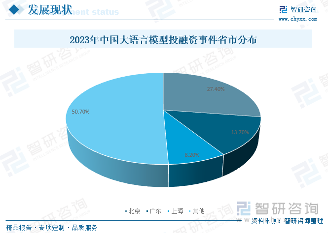 我国大型语言模型投融资事件主要以经济发达、科研技术水平较高的地区为主,北京、上海、广东三个地区大型语言模型投融资事件几乎占据全国一半的市场份额。