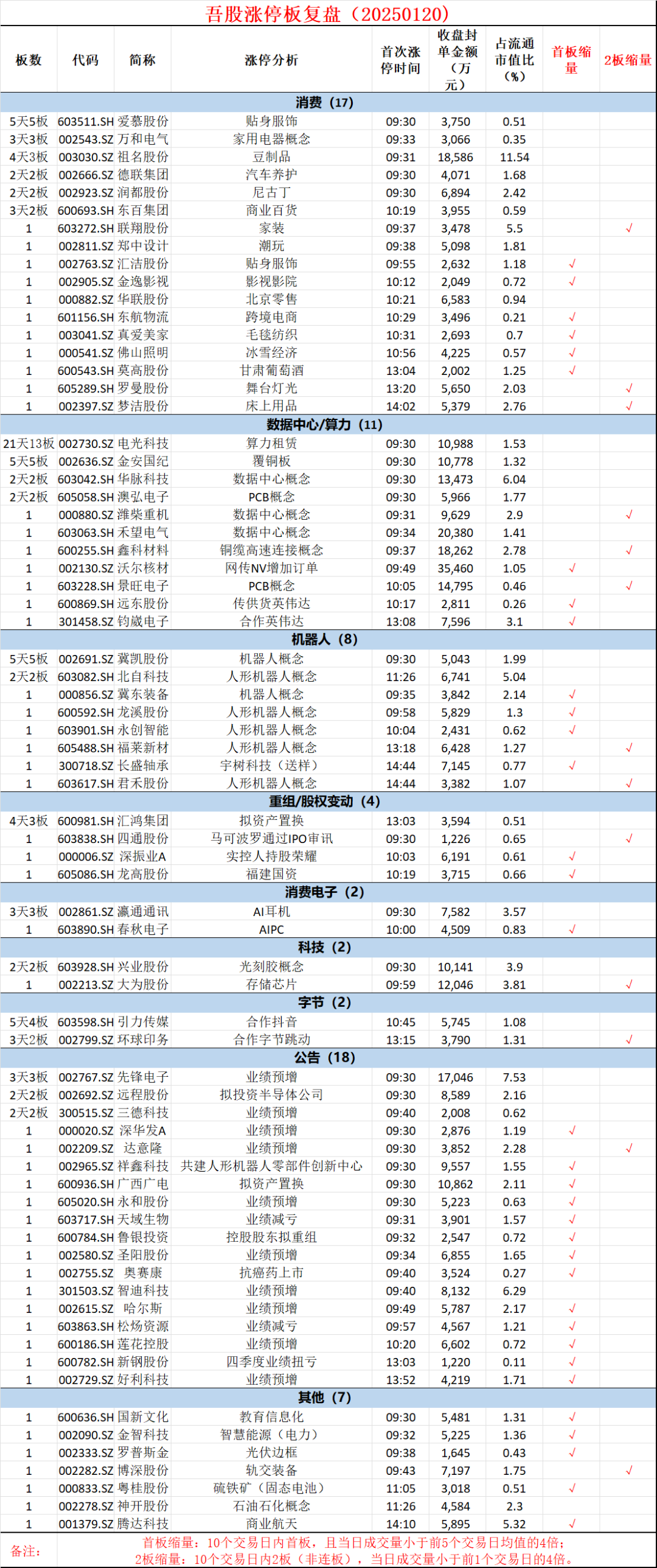 创业板指强势,主要是因为宁德时代、新易盛、阳光电源贡献点数靠前。 涨停家数71,上个交易日57。涨停排队资金有所回暖至50.2亿元。尽管涨停家数和涨停排队资金有所好转,但是涨停封板率有所下降至67%。 近期不确定因素较多,再加上有相对稳定的年报披露预增,资金有相当一部分选择涌入2024年报预增板块,今日再次收涨超2%。有13家相关公司晋级涨停板,其中9家为缩量首板。 此前晋级7连扳的市场最高标金奥博今日走势异常曲折。开盘后丝滑跌停,此后振幅非常剧烈,最后收盘前出现大幅反弹,收跌5.13%。继续受此前高标美邦股份连续三日跌停影响,目前市场高标挑战异动难度较大,需要重视。 多地推出消费补贴,且春节将至消费板块个股出现较大异动。共计17家股票走出涨停板,但同时板块内部分化较为明显,服装类、电器类、电商类都有涨停。扩散效应较强,但是连板晋级情况压力较大。 目前板块内最高板是爱慕股份5连板,盘中振幅较大,换手率相较历史水平处于高位。 数据中心和机器人方面尽管并没有新的消息面刺激或者利好政策的出台,今日分别贡献11个和8个涨停板。 算力板块的电光科技目前21天13板,已经走出了第三波,是近期股性最为活跃的个股,今天还是缩量晋级,换手率仅6.26%。 此前连板数最多的三只个股,爱慕股份、金安国纪和冀凯股份今日也都成功晋级5连板。同时这三只股也分别隶属于消费、数据中心和机器人三个板块。可见目前市场高标带来的板块效应更能吸引资金的流入。除了爱慕股份在开盘涨停后出现大幅炸板后回封,其余没有收到任何挑战,且换手率都保持在7%以下,明天同样值得重点关注。 TikTo方面宣布恢复美国地区服务也给小红书概念带来冲击,开盘后迅速下跌,跌幅一度超过2%,尽管盘中有所反弹,但最终还是收跌1.39%,未来复涨压力较大。 此外,消费电子、科技和字节相关板块也有个股异动。 今晚特朗普就要发表就职演讲,其在上任前就有诸多动作。如宣布发币实现飙涨,恢复TikTok在美国的服务。今晚注定是个不眠夜。
