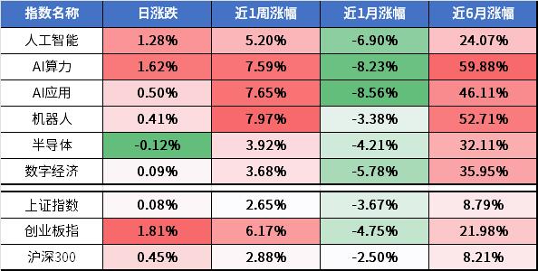 今日科技板块继续反弹,AI硬件方向走强,铜缆高速连接概念大涨。中长期来看,科技行情预期积极。相关细分产业指数近期表现如下: