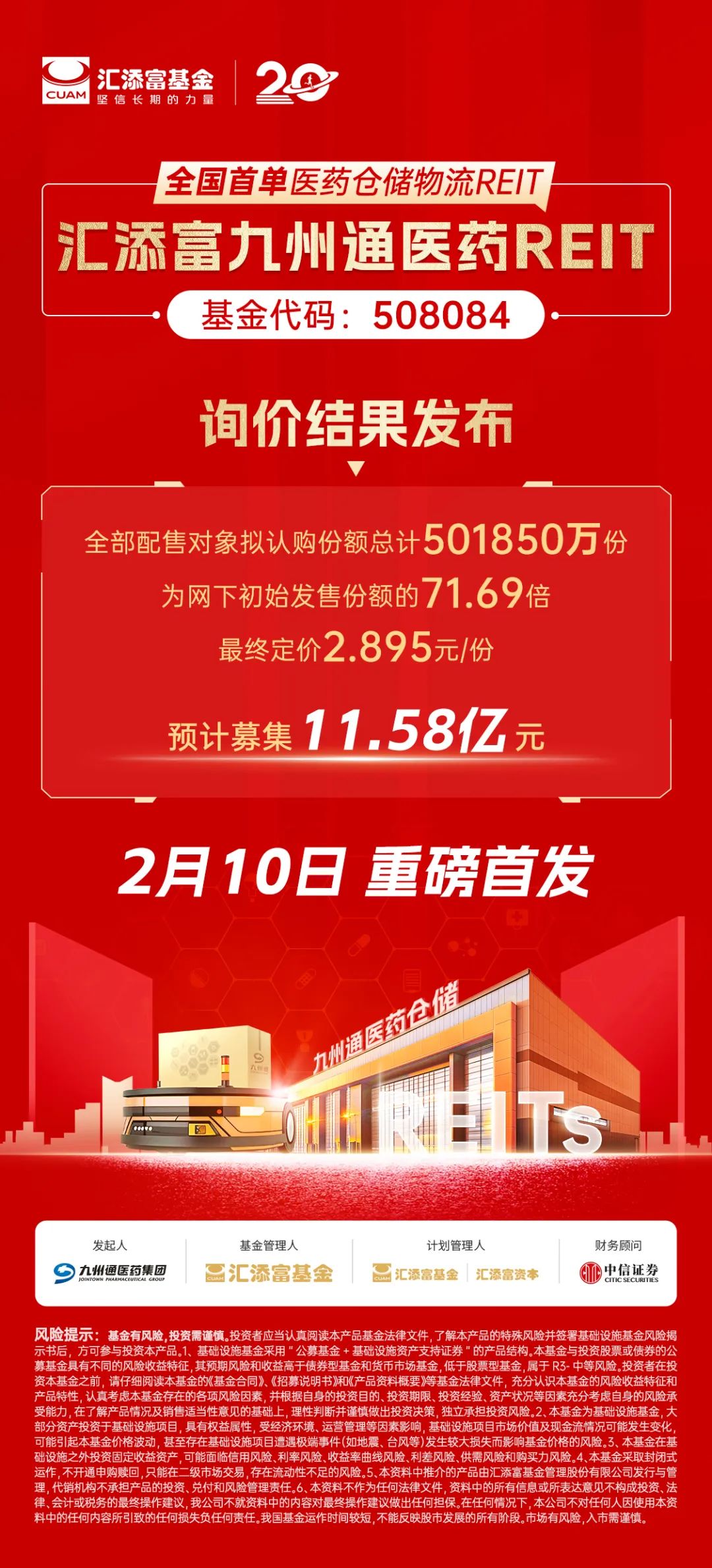 根据基金份额发售公告,此次汇添富九州通医药REIT全部配售对象拟认购份额总计501,850万份,为网下初始发售份额数量的 71.69 倍,最终定价2.895元/份。产品将于2月10日正式首发,若本次发售成功,预计将募集资金总额11.58亿元。