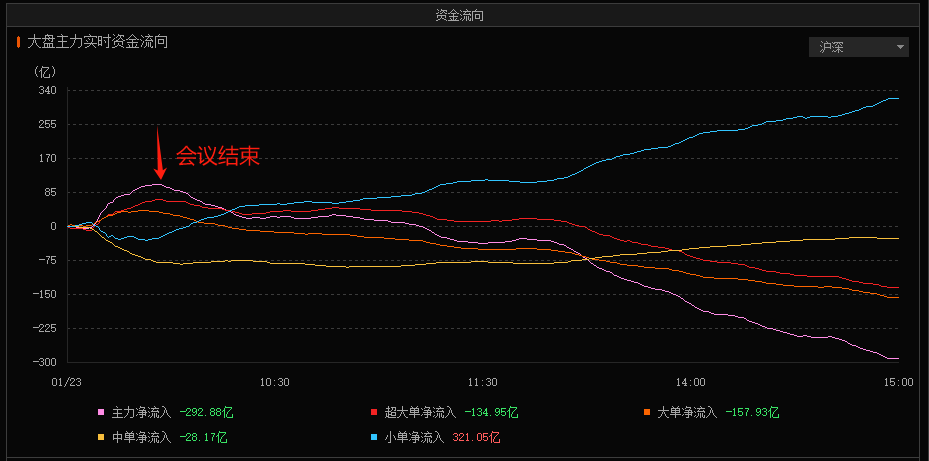 但是大盘冲高回落,我们看资金流的话其实就是早盘主力和机构一直在买,然后会议结束后,大单就开始流出了,这个其实挺诡异的。