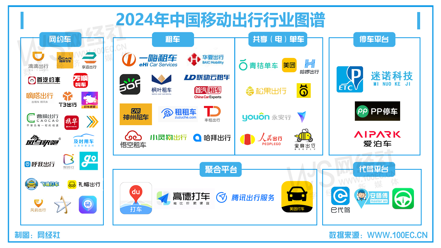 1)网约车:滴滴出行、曹操出行、T3出行、花小猪出行、享道出行、首汽约车、嘀嗒出行、神州专车、斑马快跑、、及时用车、呼我出行、旅程约车等;