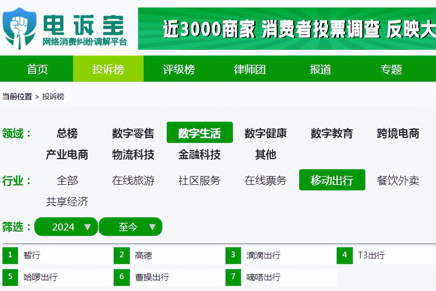 据网络消费纠纷调解平台网经社“电诉宝”显示,2024年全年在移动出行平台按投诉量排名依次为:智行、高德、滴滴出行、T3出行、哈啰出行、曹操出行、嘀嗒出行。