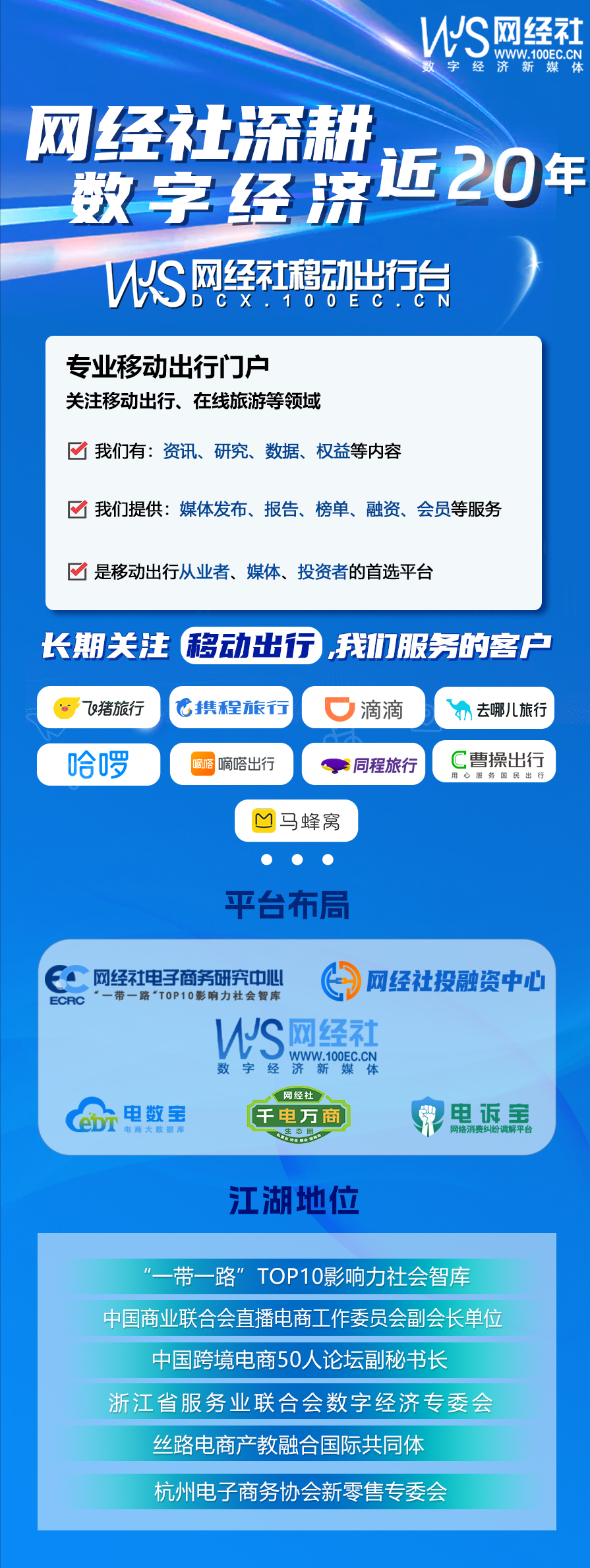 网经社深耕数字经济行业近20年,长期关注移动出行,我们服务的客户:滴滴出行、同程旅行、携程、去哪儿、飞猪、哈啰出行、马蜂窝、曹操出行、嘀嗒出行等。