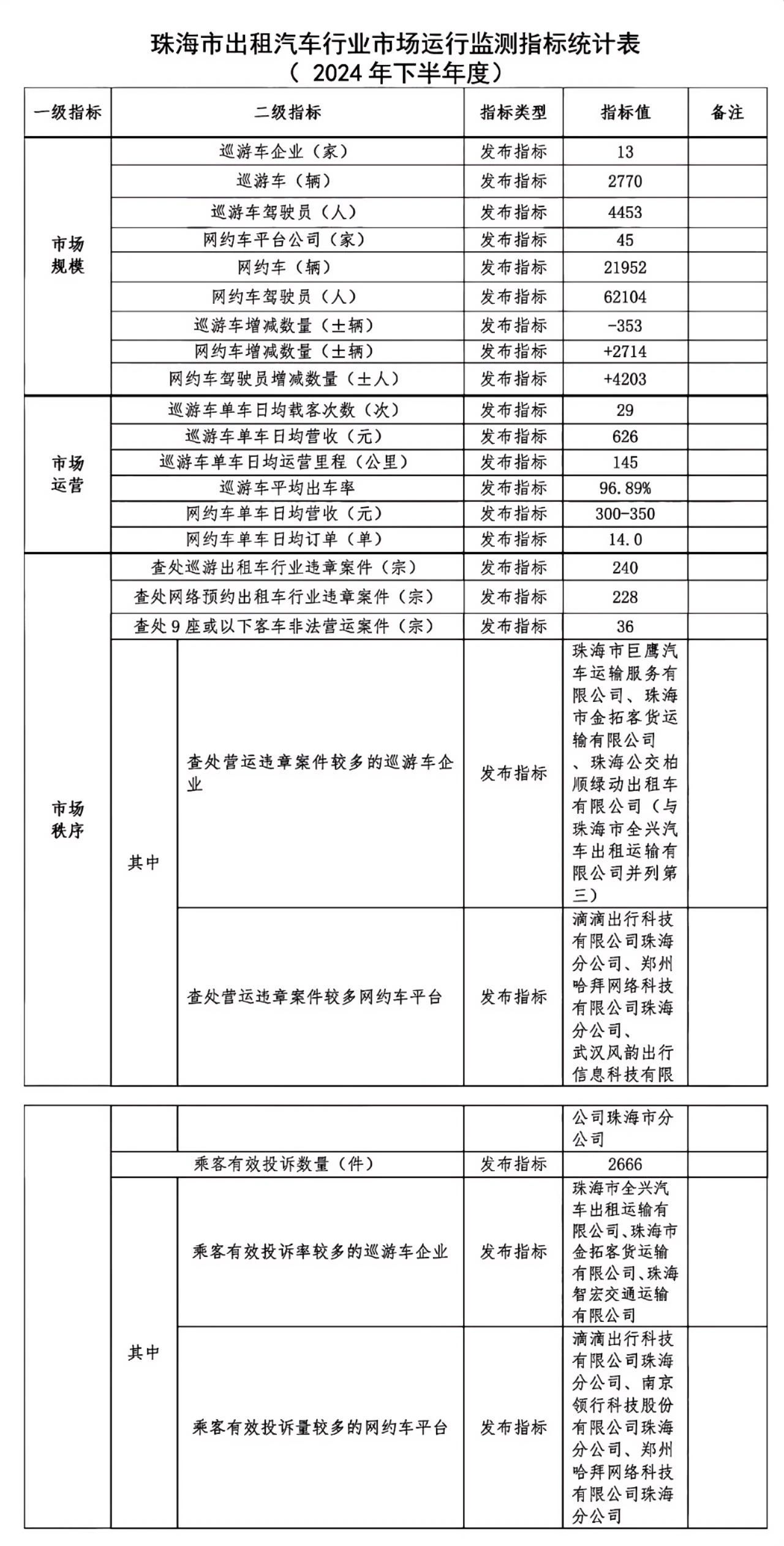在市场秩序方面,2024年下半年,珠海市交通运输主管部门共查处巡游出租汽车行业违章案件240宗,网络预约出租汽车行业违章案件228宗,9座或以下客车非法营运案件36宗。四家巡游出租汽车企业营运违章案件数量排名居全市前三:珠海市巨鹰汽车运输服务有限公司、珠海市金拓客货运输有限公司、珠海公交柏顺绿动出租车有限公司(与珠海市全兴汽车出租运输有限公司并列第三)。三家网络预约出租汽车平台公司营运违章案件数量排名居全市前三:滴滴出行科技有限公司珠海分公司、郑州哈拜网络科技有限公司珠海分公司、武汉风韵出行信息科技有限公司珠海市分公司。三家企业的乘客有效投诉率在全市巡游出租汽车企业排名前三:珠海市全兴汽车出租运输有限公司、珠海市金拓客货运输有限公司、珠海智宏交通运输有限公司。三家企业乘客有效投诉量在全市网络预约出租汽车平台公司排名前三:滴滴出行科技有限公司珠海分公司、南京领行科技股份有限公司珠海分公司、郑州哈拜网络科技有限公司珠海分公司。