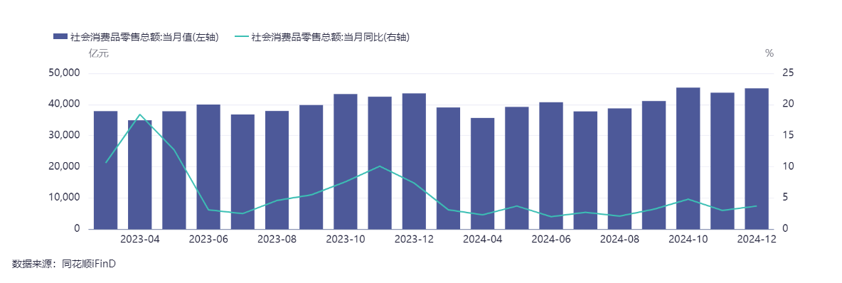 12月社会消费品零售总额同比增速3.7%,同比增速较上月提升0.7个百分点,略高于市场预期,环比增长0.12%,较前值小幅回调,反映出消费活动有所提振。