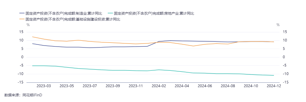 制造业投资增速高位震荡,全年累计同比9.2%,较前值小幅下跌。制造业维持高位与设备家电以旧换新等政策支持、出口回升等因素存在关联。运输设备和医药等行业投资回升幅度较为明显,食品制造、有色等行业增速回落较多。