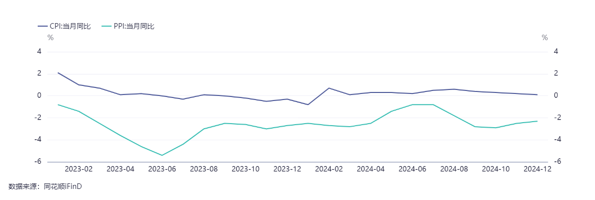 2024年12月份,全国居民消费价格同比上涨0.1%,环比持平。工业生产者出厂价格同比下降2.3%,环比下降0.1%。