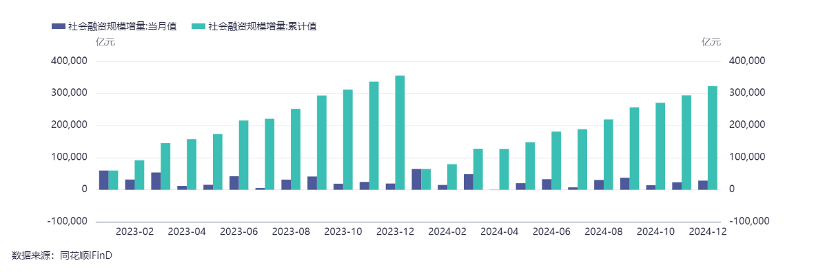 12月新增信贷9900亿元,同比少增1800亿元,但仍然好于市场预期。居民贷款同比多增,但企业贷款大幅少增。其中居民短期贷款新增588亿元,同比少增171亿元,但是相较于季节性规律仍然偏强。居民中长期贷款同比增加3000亿元,同比大幅多增1500亿元,与同期国内房地产销售数据基本一致。企业短期贷款减少200亿元,同比少减430亿元,中长期贷款增加400亿元,同比少增8200亿元,表明化债政策推动了城投提前偿还相关贷款。