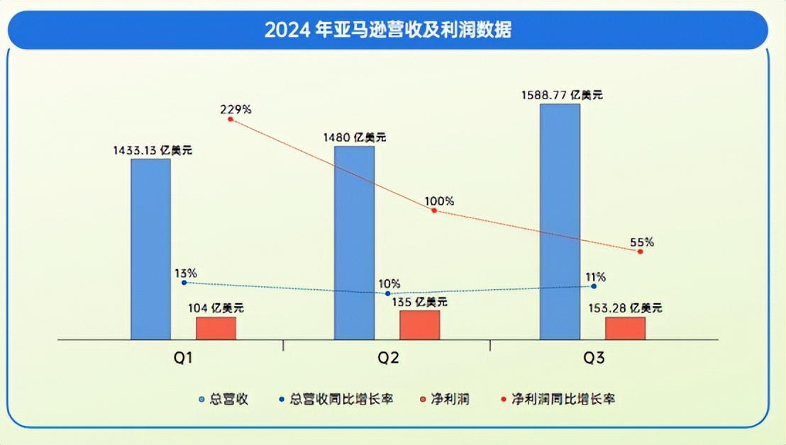 这也是亚马逊当下的境况,从财报数据来看,在2024年前三季度,其实现营收4501.67亿美元,同比增长11.20%;累计净利润为392.44亿美元,同比增长98.19%,营收和利润均保持稳健的增长。