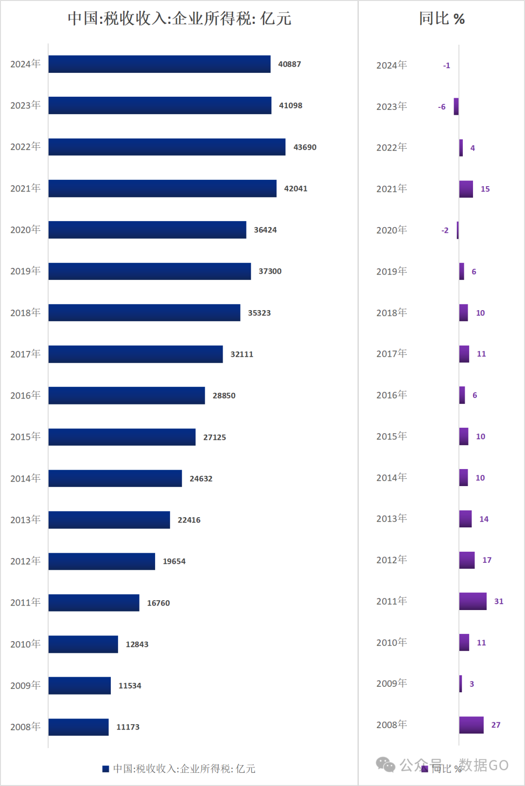 2024年,中国税收收入中企业所得税收入40887亿元,同比下降1%,;连续2年下降,连续2年下降的情况历史上比较少见。