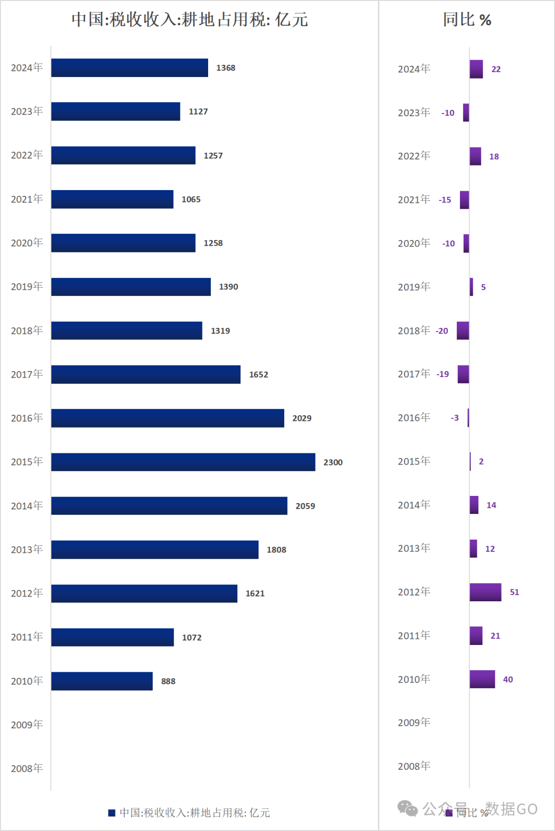 2024年,中国税收收入中耕地占用税收入1368亿元,同比增长22%。