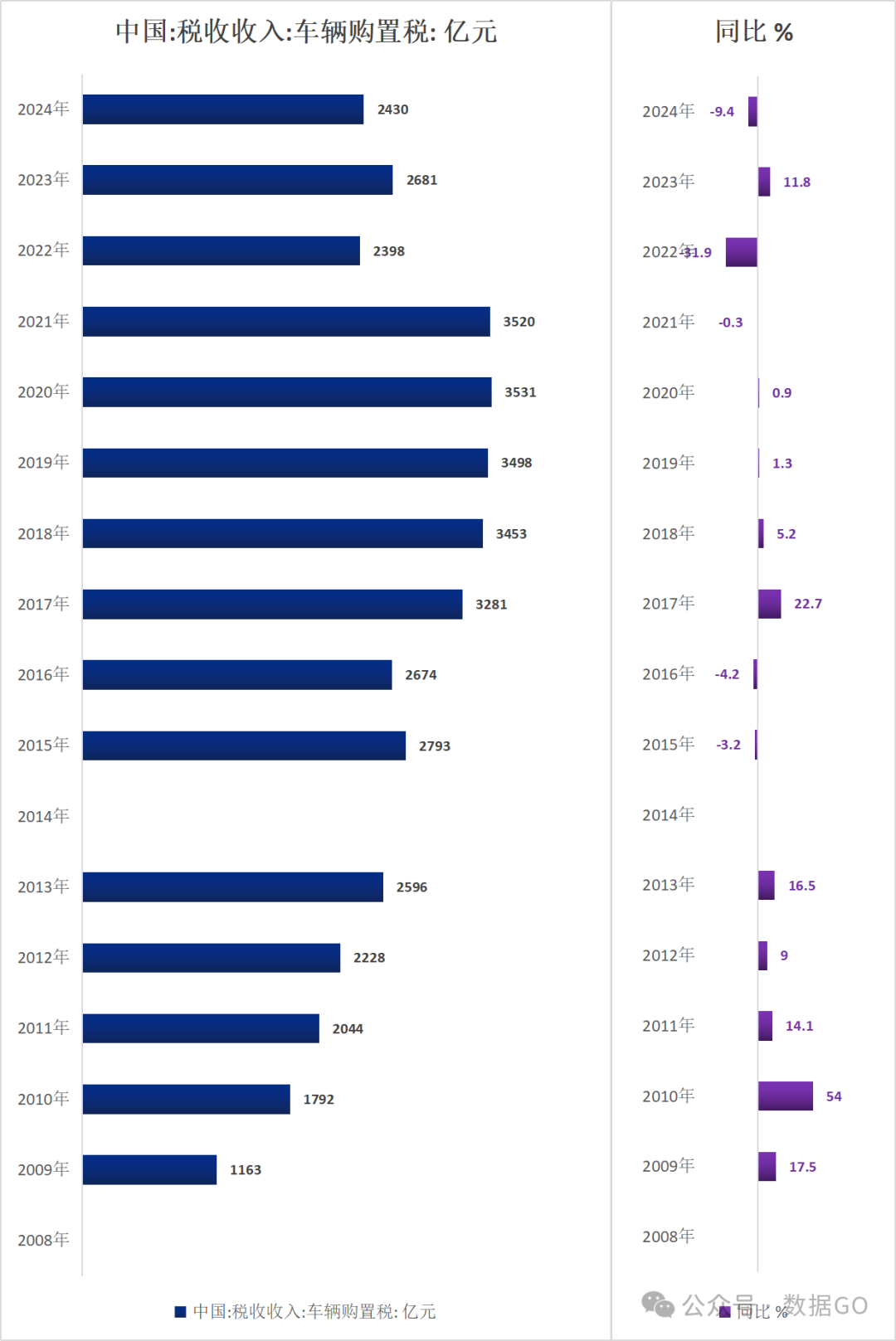 2024年,中国税收收入中车辆购置税收入2430亿元,同比下降9.4%。