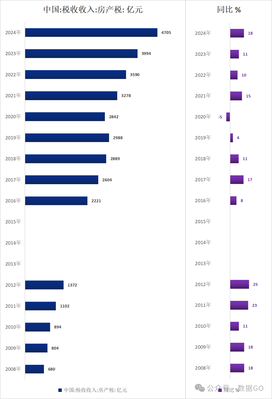 2024年,中国税收收入中房产税收入4705亿元,同比增长18%,连续4年增长。