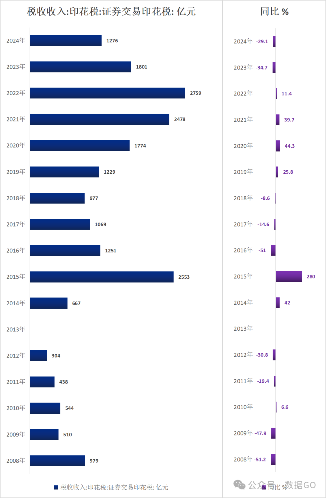 2024年,中国税收收入中证券交易印花税收入1276亿元,同比下降29.1%,连续2年下降,不到2022年高峰期的一半。