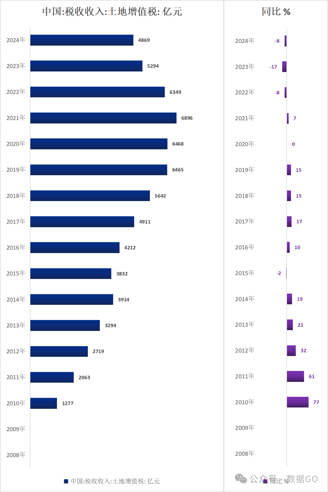 2024年,中国税收收入中土地增值税收入4869亿元,同比下降8%,连续3年下降。
