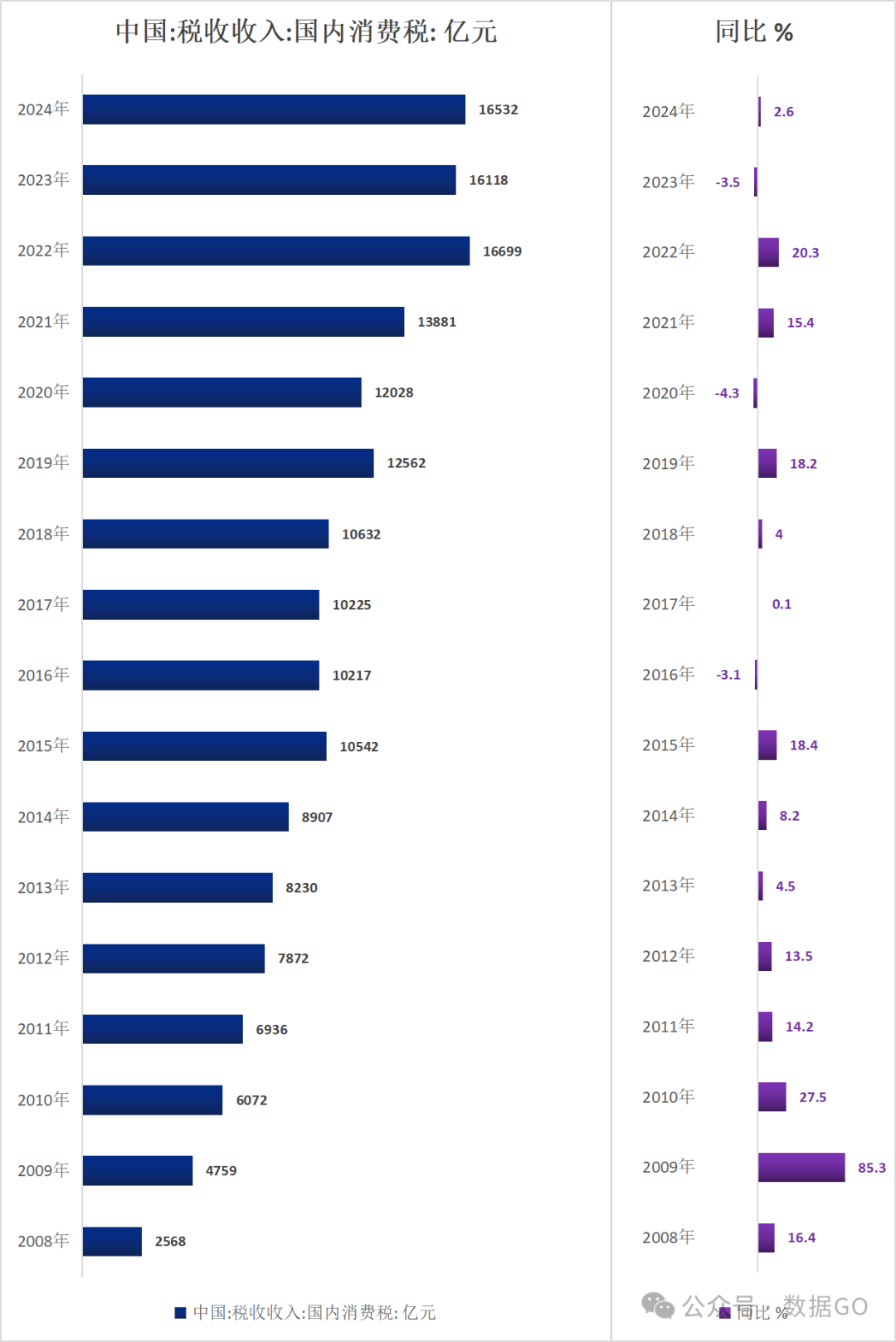 2024年,中国税收收入中国内消费税收入16532亿元,同比增长2.6%。