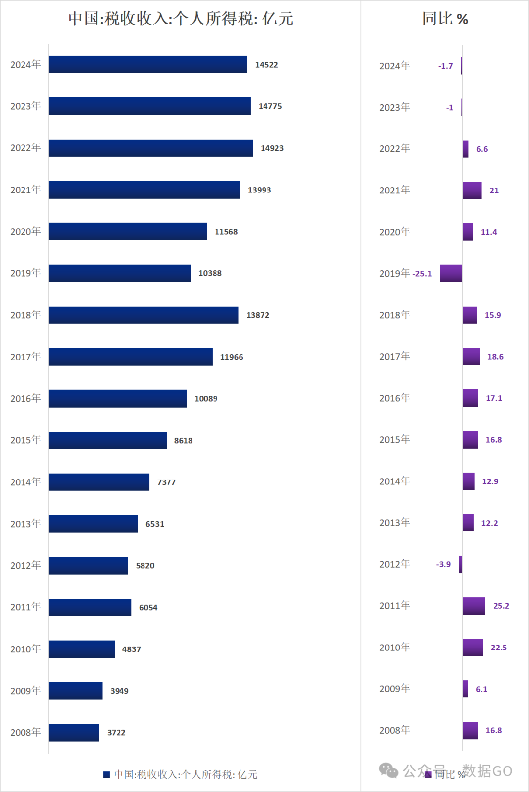 2024年,中国税收收入中个人所得税收入14522亿元,同比下降1.7%,连续2年下降。