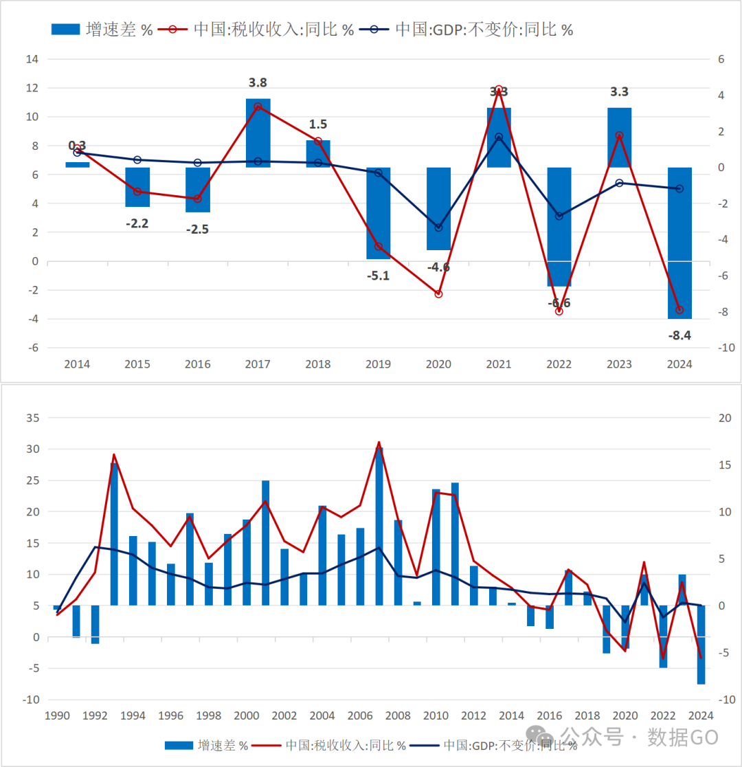 根据数据GO 1月18日发布的《中国历年GDP(1952-2024)》测算,2024年税收收入与GDP增速差是-8.4%。从1990年至今的对比数据看,一般都是财政收入增速大幅超过GDP增速,而最近几年情况出现逆转,2024年增速差是1990年以来最大负差值。