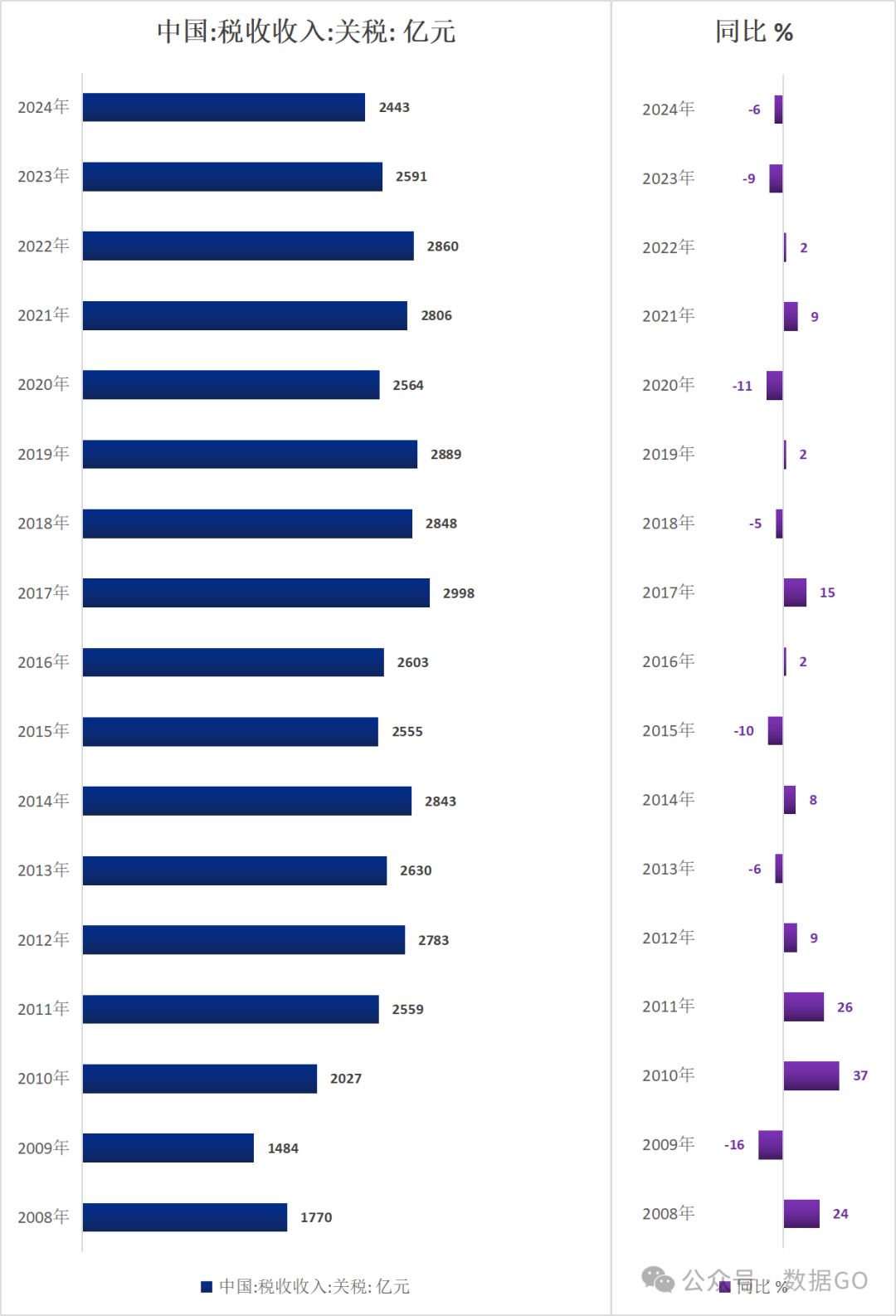 2024年,中国税收收入中关税收入2443亿元,同比下降6%,连续2年下降。