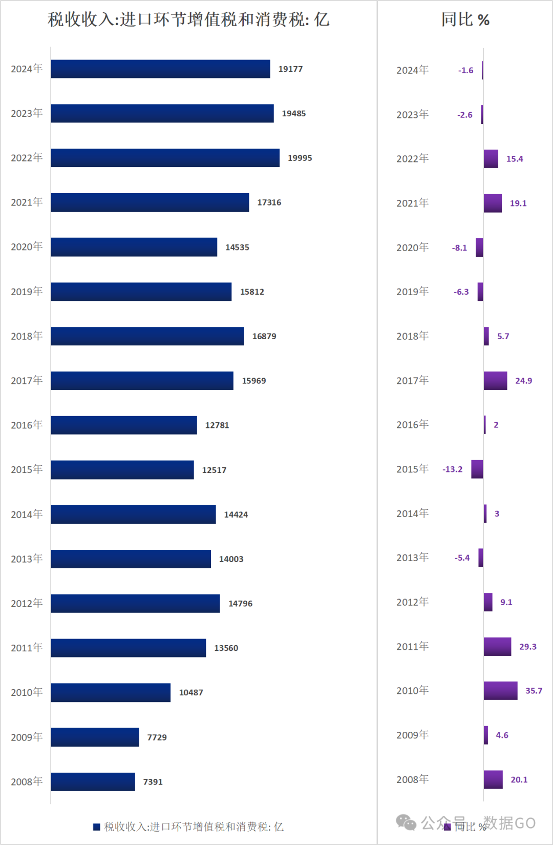 2024年,中国税收收入中进口环节增值税和消费税收入19177亿元,同比下降1.6%,连续2年下降。