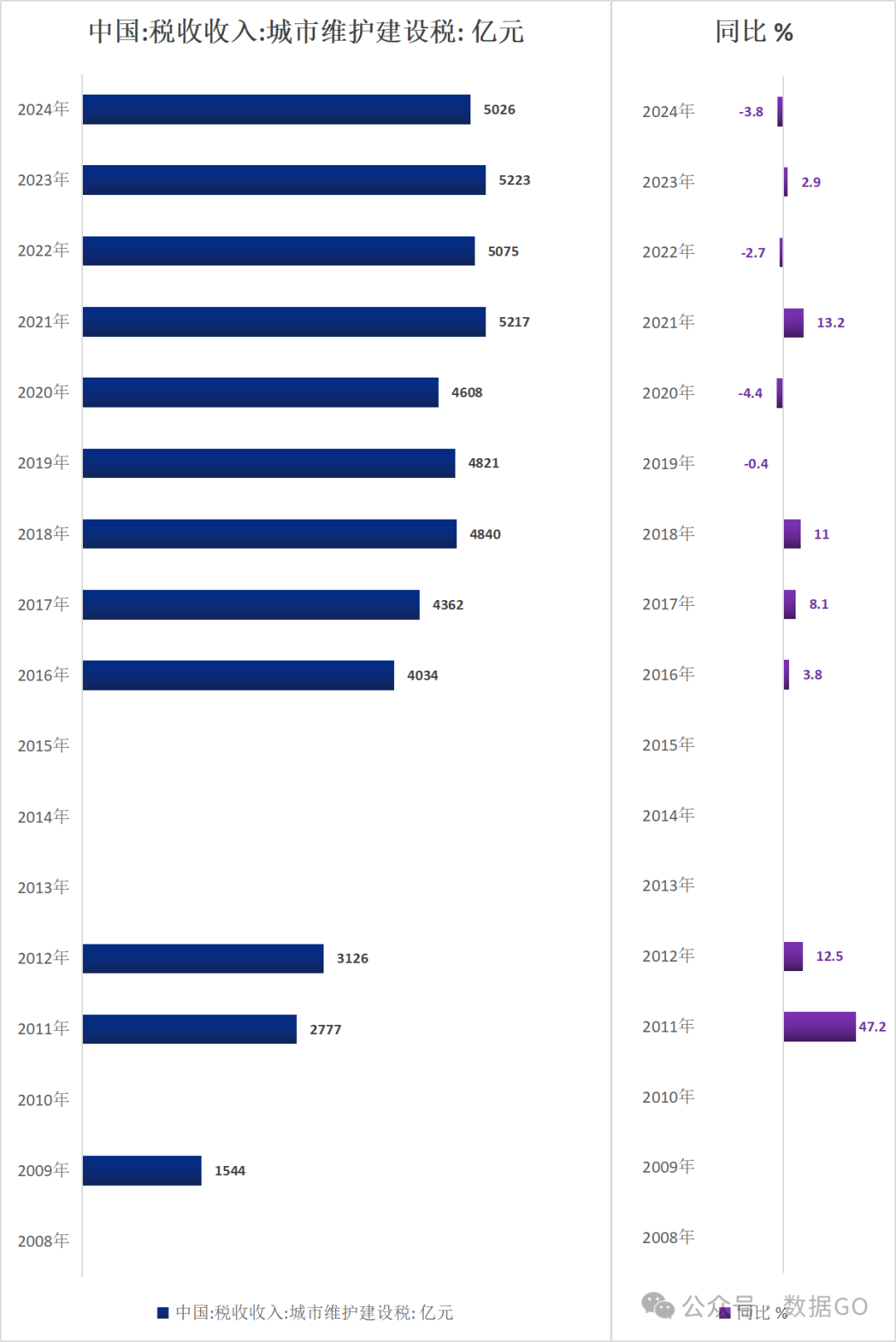 2024年,中国税收收入中城市维护建设税收入5026亿元,同比下降3.8%。