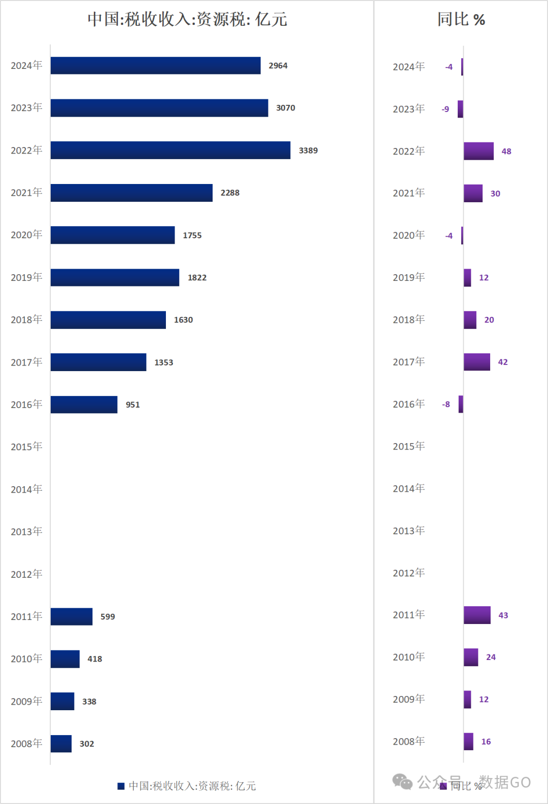 2024年,中国税收收入中资源税收入2964亿元,同比下降4%,连续2年下降。