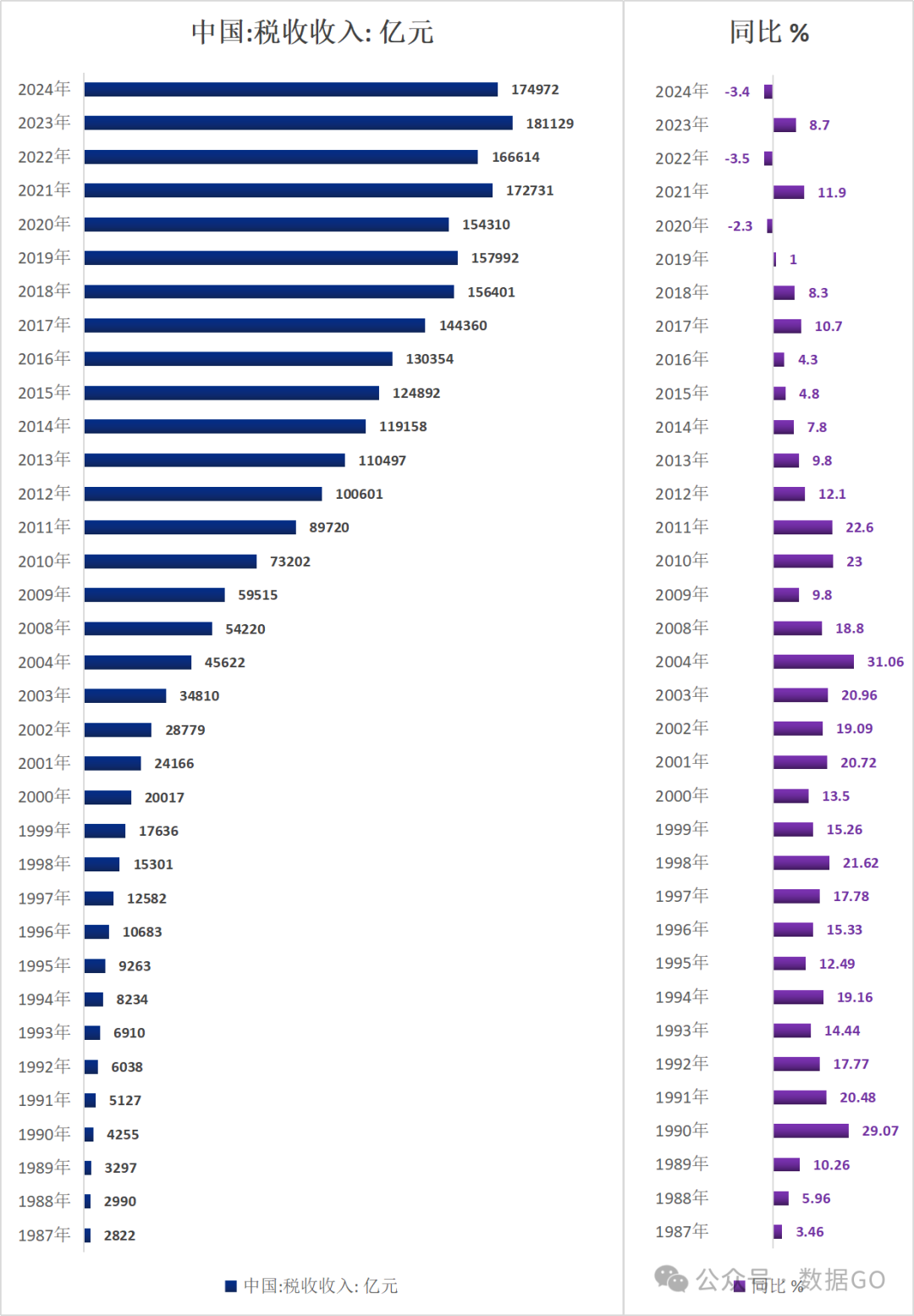 2024年,中国税收收入17.50亿元,同比下降3.4%,高位回落,2023年首次破18万亿。