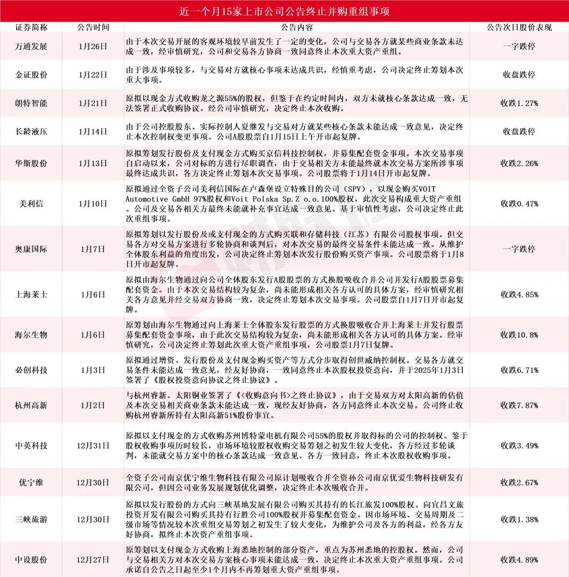 近一个月(2024.12.27-2025.1.27)包括万通发展、金证股份、朗特智能、长龄液压、华斯股份、美利信、奥康国际、上海莱士、海尔生物、必创科技、杭州高新、中英科技、优宁维、三峡旅游、中设股份在内的15家A股上市公司公告终止并购重组事项!