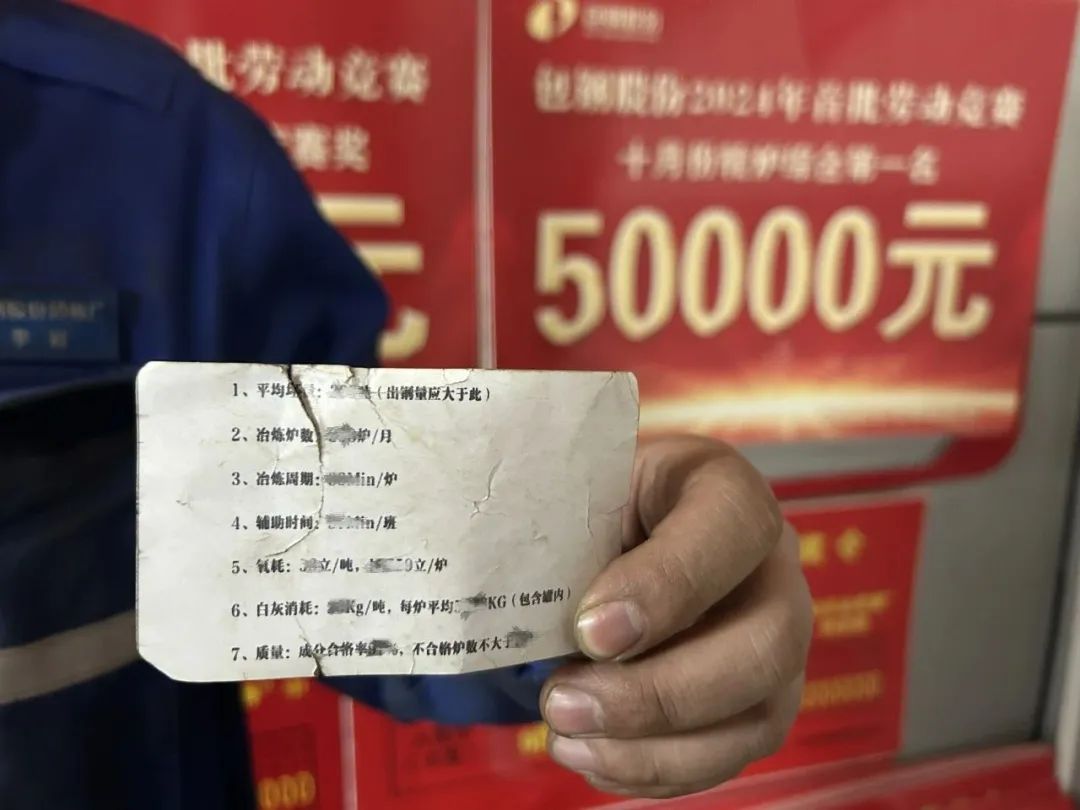 走进入2025年以来,薄板厂各产线13次打破生产纪录,粗钢日产量,宽厚板生产线铸机、轧机、精整剪切日产量,CSP生产线卷板日产量均创造历史新纪录。冶炼部丁班工长李岩走进转炉控制室,首先映入眼帘的就是LED屏上滚动播放的红色文字。“去年,我们圆满完成了生产任务,今年的要求比去年更高。”李岩说道,“十几年前,一座转炉一个班只能炼15炉钢,现在能达到20炉。”他在贴满红色嘉奖令的荣誉墙前,向记者展示了一张任务卡。由于在工衣口袋中保存了近一个月而且反复揣拿,这张卡片已经磨毛了边缘,甚至还撕裂了一个口子。卡片上标注了平均坯量、冶炼炉数、冶炼周期、辅助时间、氧耗、白灰消耗、合格率7项指标任务。手持这张卡,李岩心中有压力更有动力。而这样的任务卡,薄板厂每名职工在年初都领到了。