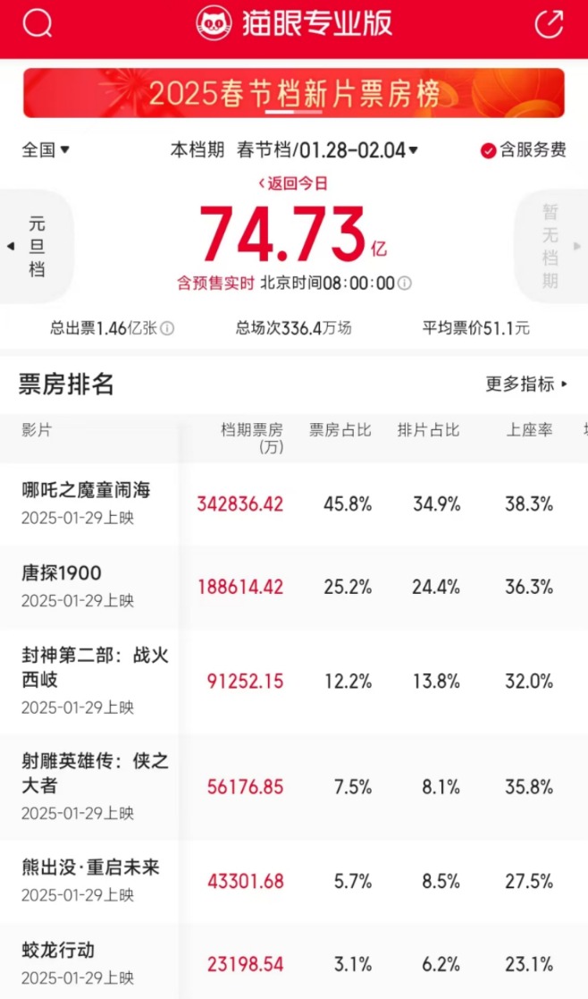 猫眼专业版数据显示,截至2月3日上午8点,春节档票房累计已达74.73亿元。其中,《哪吒之魔童闹海》一马当先,收获票房34.28亿元。《唐探1900》票房为18.86亿元,排名第二。排名第三的《封神第二部:战火西岐》票房为9.13亿元。《射雕英雄传:侠之大者》《熊出没·重启未来》和《蛟龙行动》位列第四至第六位。