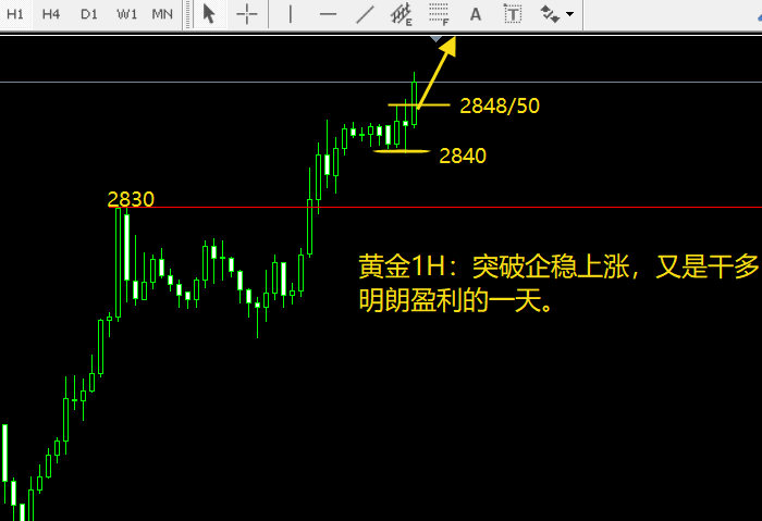 昨日国际金价两次做多顺利大涨,晚上2830做多顺利剩余到2850扫止盈;今日早盘继续冲击高点突破2850,继续围绕2848/49布局做多,又是干多方向明朗做多盈利的机会,继续奔向2900美元上方突破不变,趋势方向摆在这里,而且现在是趋势多头延续上升时间点,无论从趋势形态还是时间,今日正月初八,黄金多头都不会结束,时间拐点没有来临,不要去猜顶抄顶。保持顺势交易,行情明朗,简单;