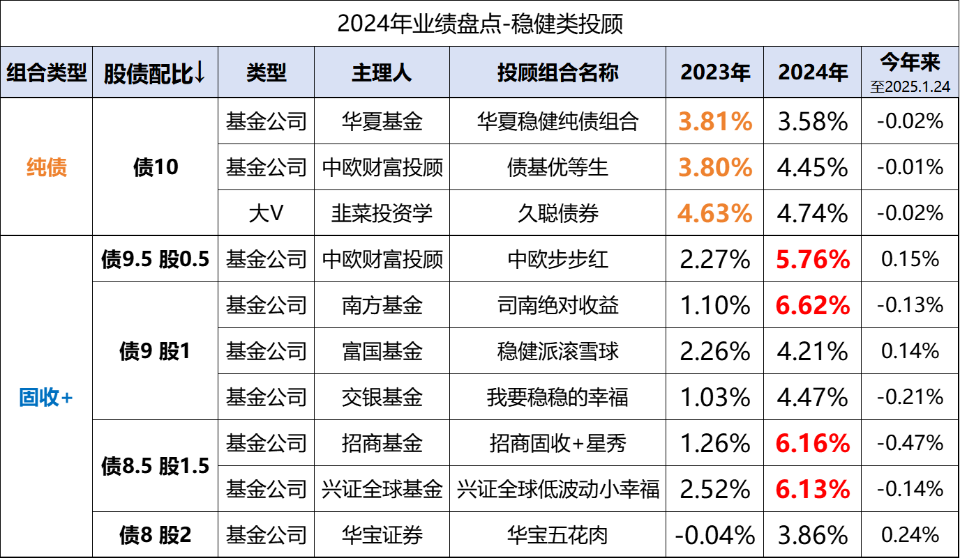 1、 把2023年和2024年结合起来看的话,投资“纯债基金”的投顾组合业绩更稳,连续两年涨4%左右。这部分我主要选了业绩好且成立时间比较久的3个:华夏稳健纯债组合、中欧债基优等生、久聪债券。