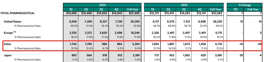 受此影响,中国区收入同比下滑20%至53.94亿美元,占据默沙东全球制药业务9.4%的份额。
