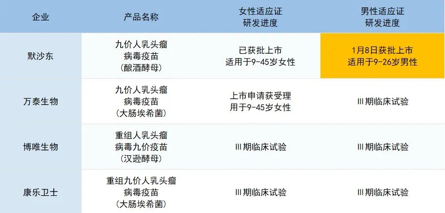2025年1月8日,默沙东的佳达修HPV疫苗多项新适应症获得国家药品监督管理局的上市批准,适用于9岁至26岁男性接种,成为中国境内首个且目前唯一获批、可适用于男性的HPV疫苗。