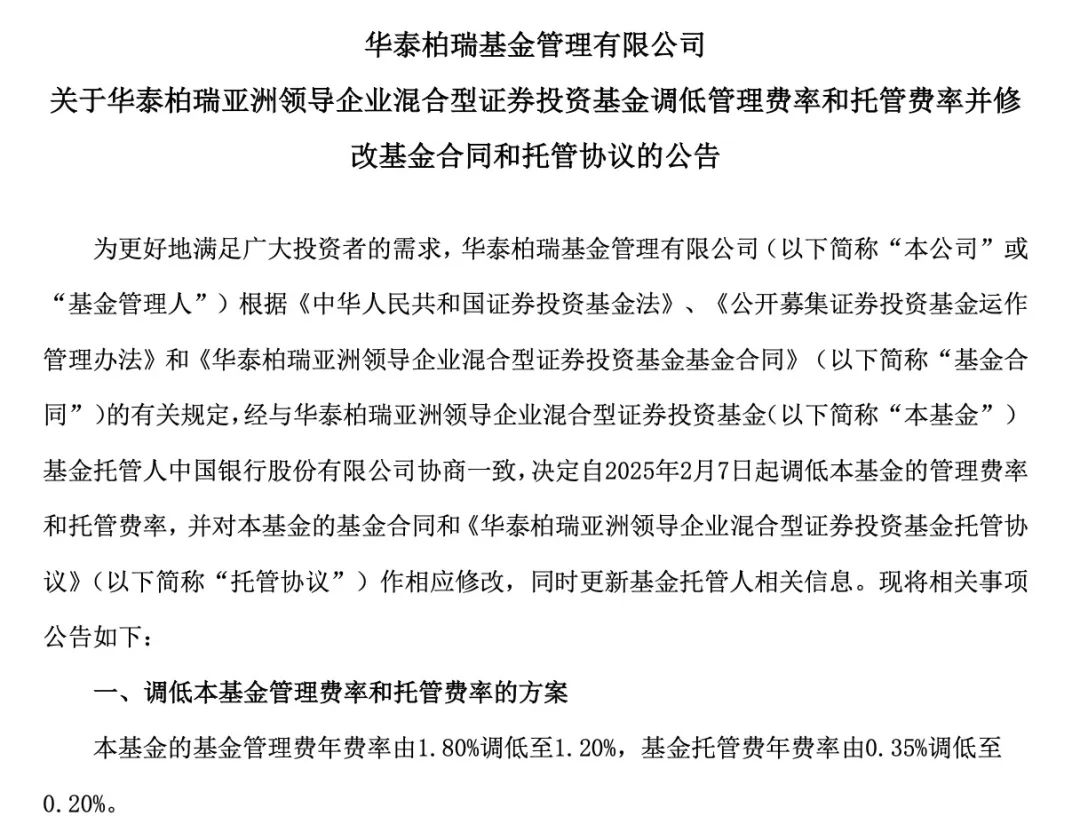 2月6日,华泰柏瑞基金公告,为更好地满足投资者需求,自2025年2月7日起调低华泰柏瑞亚洲领导企业混合(QDII)的管理费率和托管费率,其中,管理费年费率由1.80%调低至1.20%,托管费年费率由0.35%调低至0.20%。