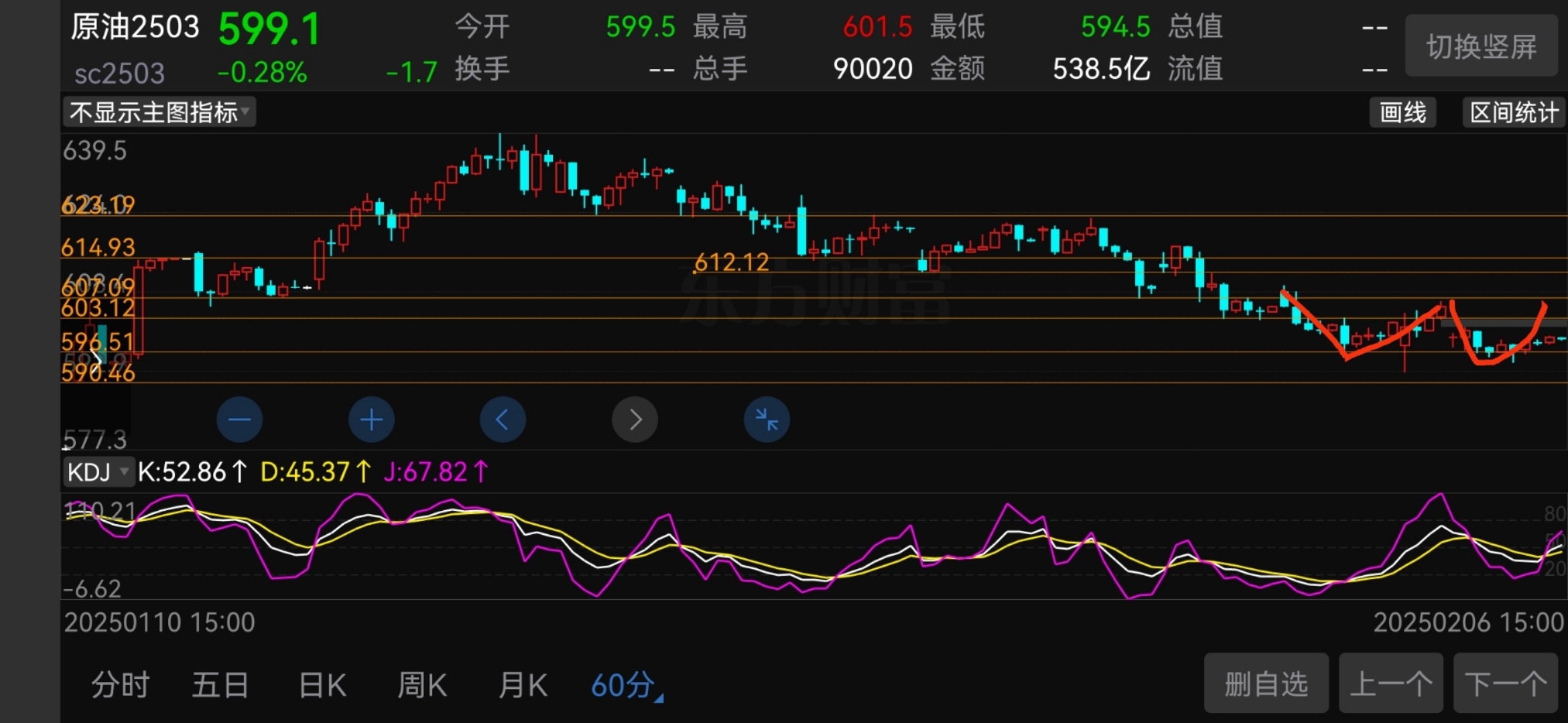 原油(SC2503)日内整体依托提示的597-596支撑区间呈现企稳回升走势