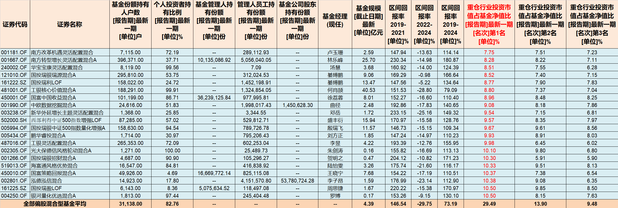 按"第一重仓行业投资市值占基金净值比"从低到高排名,入选持仓行业最分散基金20只,详见下表。