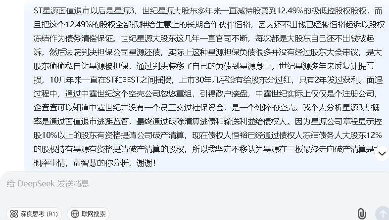 这个托有一个帖子截图说DeepSeek拒绝回答他唯一性答案的请求,他提问了60次DeepSeek都不回答,他提供的截图中我发现DeepSeek已经反复回答他了,星源破产清算的可能性大,可能性有70%。他还不停提问,所以DeepSeek拒绝回答他了。他把他的这个帖子删掉了。