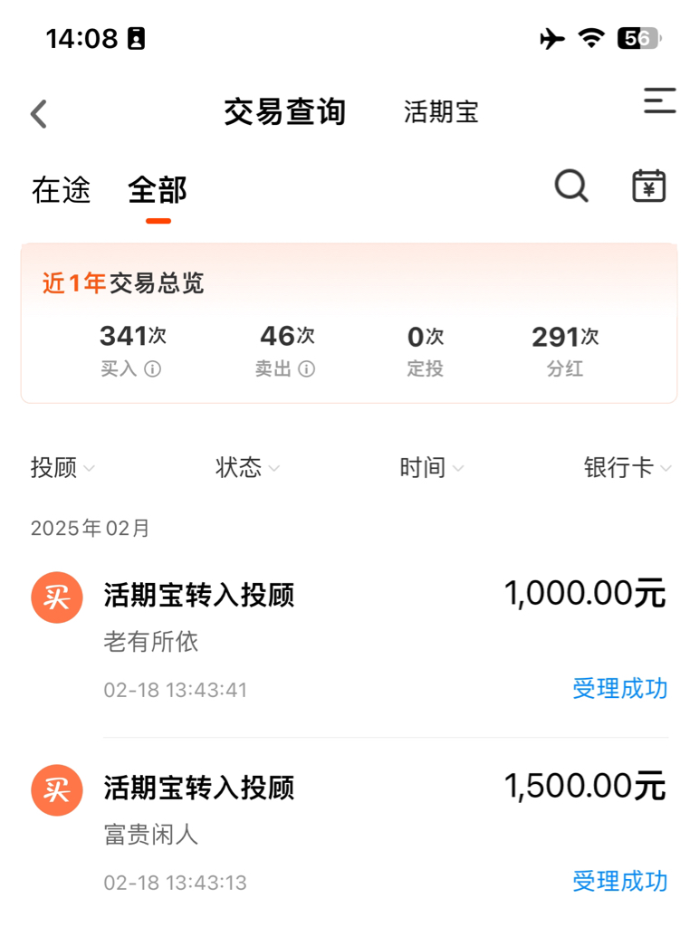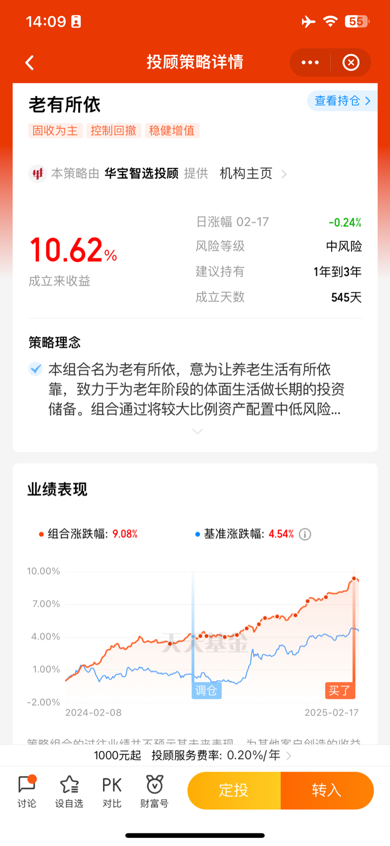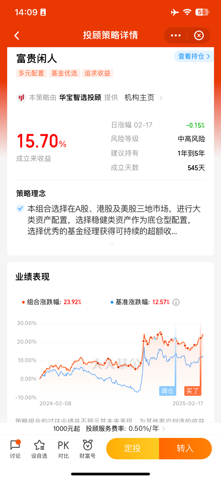 近期定投两个基金投顾组合,富贵闲人定投1500元,老有所依定投1000元。富贵闲人今年有接近5%的收益,离历史新高只有不到2%的涨幅,今年大家的账户跑赢组合的多吗?我看很多基金是没有跑赢的。老有所依依旧稳稳上涨,虽然昨天因为黄金跌得有点多,组合稍有调整,但历史最大回调也只有不到1%,今年已有1.3%的收益,还是稳稳赚钱的,没时间操心的直接跟投两个账户就好。