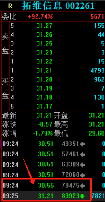 2月18日周二,早盘集合竞价,拓维信息低开1.79%,但有一个小细节,最后时刻有资金上抢,从低开4%左右到低开2%左右。(多头反抗)