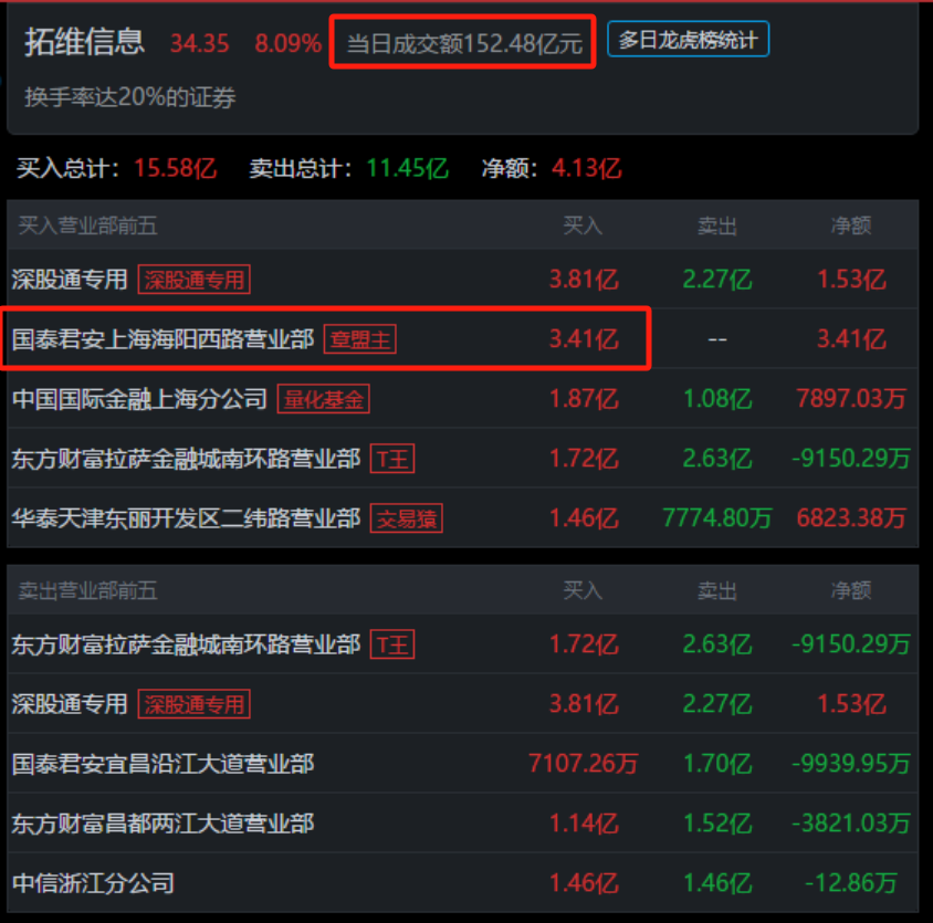 第一位,上海海阳西路,顶级游资章盟主的席位之一,最近在拓维信息进进出出很多回了。