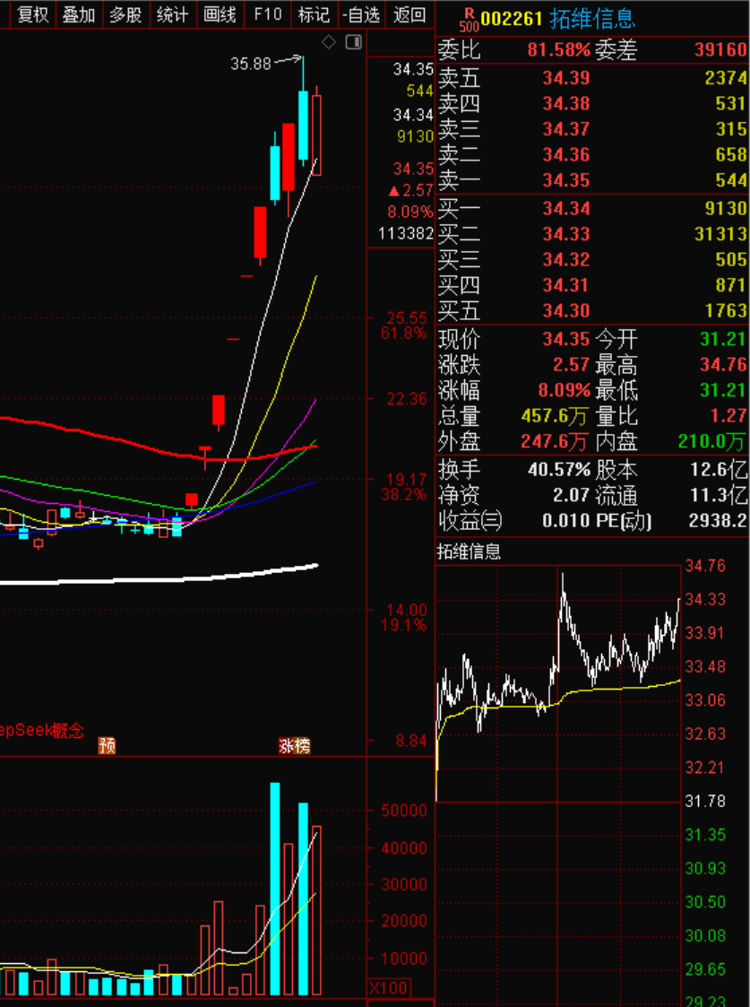 2月17日周一,拓维信息冲高回落,下跌4.31%,成交高达174.8亿。