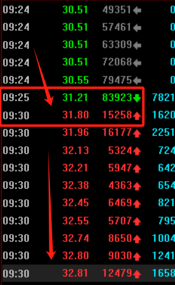 开盘后,多头发力,快速翻红!(9:15第一秒的高开程度代表市场惯性,9:20的第一秒代表获利盘的态度,9:25的最后一秒代表主力的态度,9:30开盘第一秒代表市场态度)