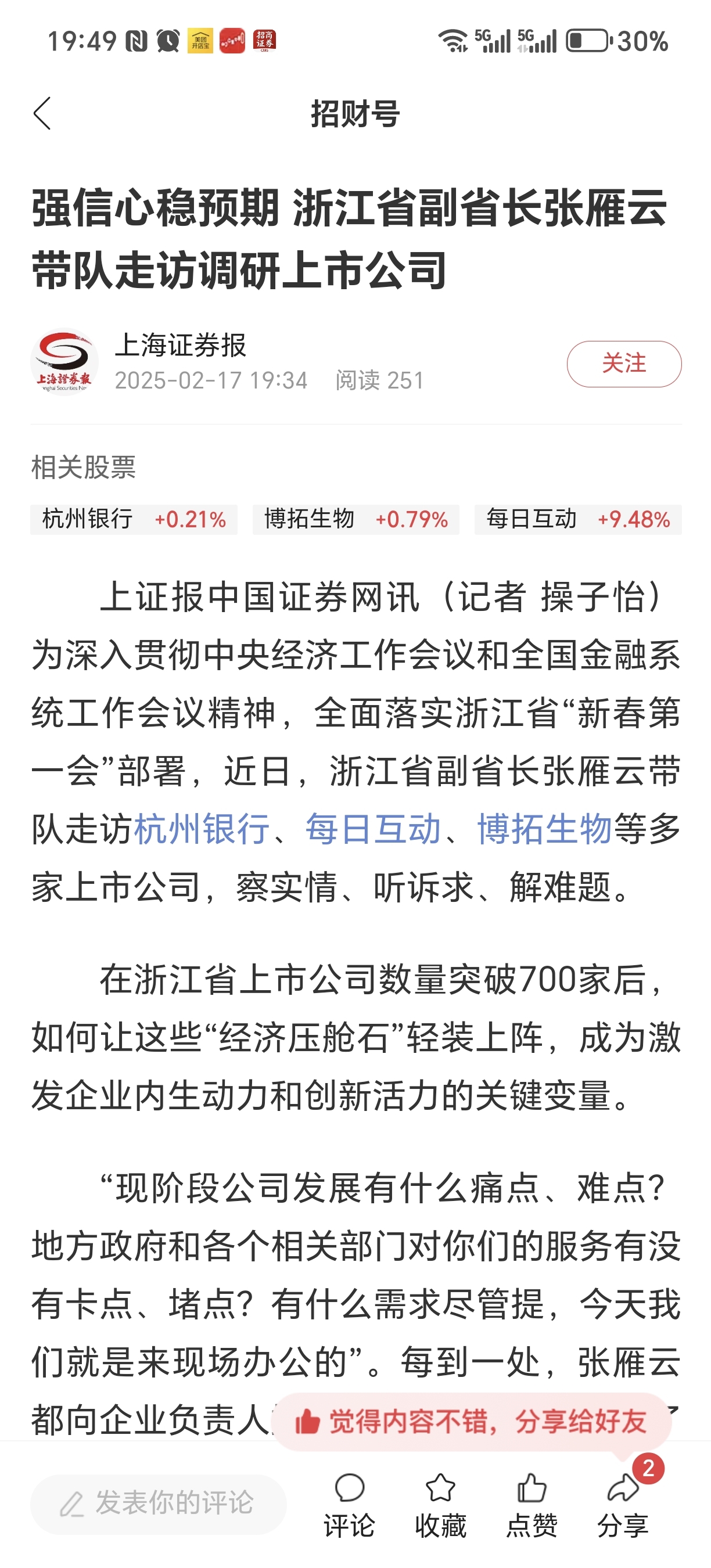上证报中国证券网讯(记者 操子怡)为深入贯彻中央经济工作会议和全国金融系统工作会议精神,全面落实浙江省“新春第一会”部署,近日,浙江省副省长张雁云带队走访杭州银行、每日互动、博拓生物等多家上市公司,察实情、听诉求、解难题。