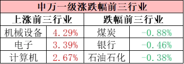 截至收盘,申万一级行业中,机械设备板块强势领涨,电子、计算机紧随其后,煤炭、银行、石油石化出现回调。