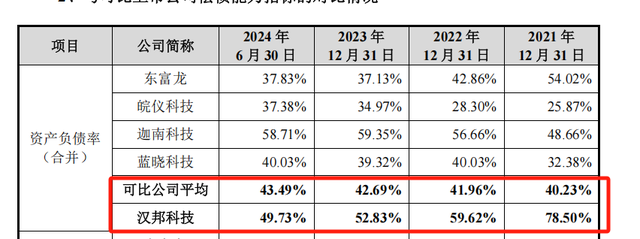 值得一提的是,除了逾期率高,汉邦科技的资产负债率也较高。报告期内,公司的资产负债率(合并)分别为78.50%、59.62%、52.83%和49.73%。其中,近两年负债率走低与融资有关。但即便如此,可比公司的平均值分别为40.23%、41.96%、42.69%和43.49%,汉邦科技的负债率依然高于这些公司,而公司解释的原因是主要还是融资单一。