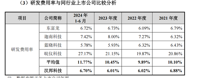 在研发方面,汉邦科技的研发费用分别为2204万元、2899万元、3718万元和2204万元,对应的研发费用率分别为6.88%、6.02%、6.01%和6.70%。尽管公司的研发投入呈增长趋势,但其研发费用率依然低于同行业可比公司平均值,报告期内,同行上市公司的平均值在约10%以上。