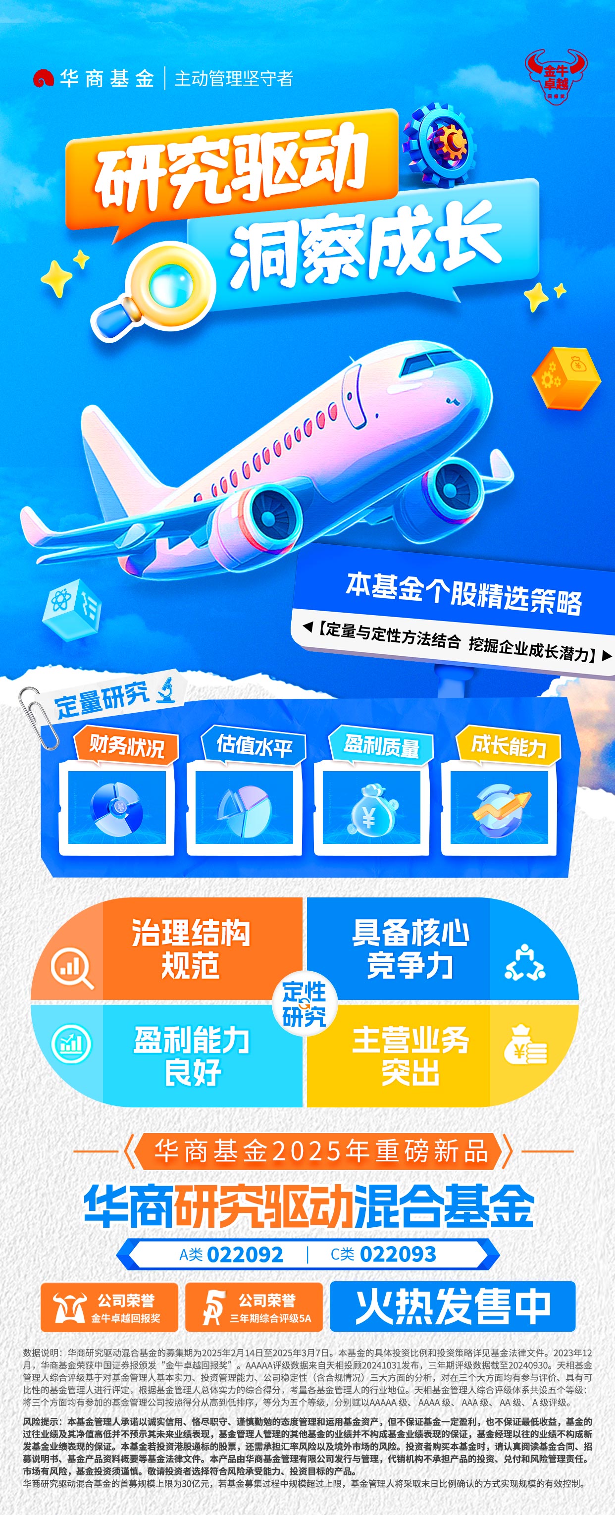 凭借研究驱动投资的核心理念、科学合理的投资策略、专业的投研团队和丰富的投资经验,在当前复杂多变的市场环境中,正在发行的华商研究驱动混合基金(A类:022092,C类:022093)或为投资者提供了一个极具吸引力的投资选择。