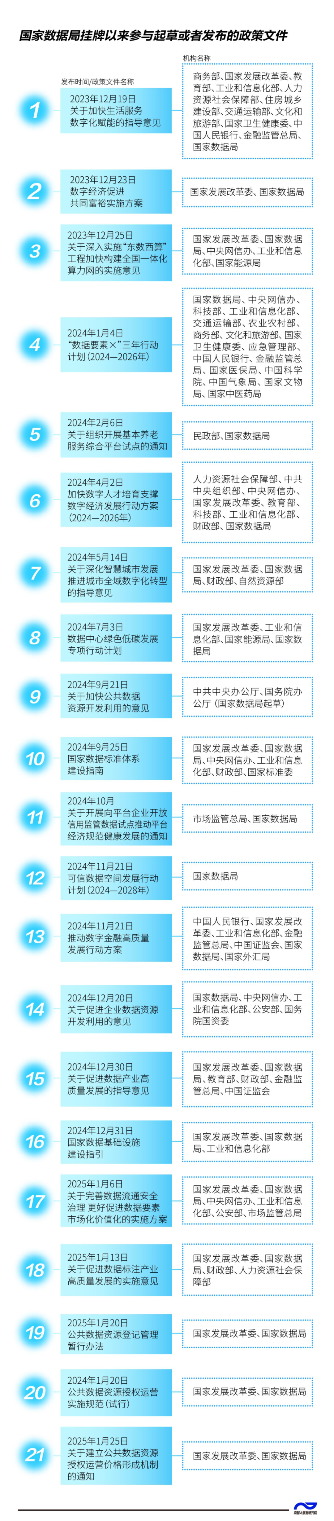 20余份重量级政策文件!国家数据局在短短一年多时间,已参与起草或发布20多份重量级政策文件,包括“数据要素×”三年行动计划、全国一体化算力网、城市全域数字化转型、数字经济促进共同富裕、国家数据标准体系建设指南、可信数据空间发展、数据基础设施建设指引等。